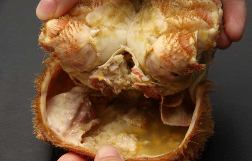 利尻島で獲れた旬の毛ガニを、茹で上げではなく、蒸して加工。