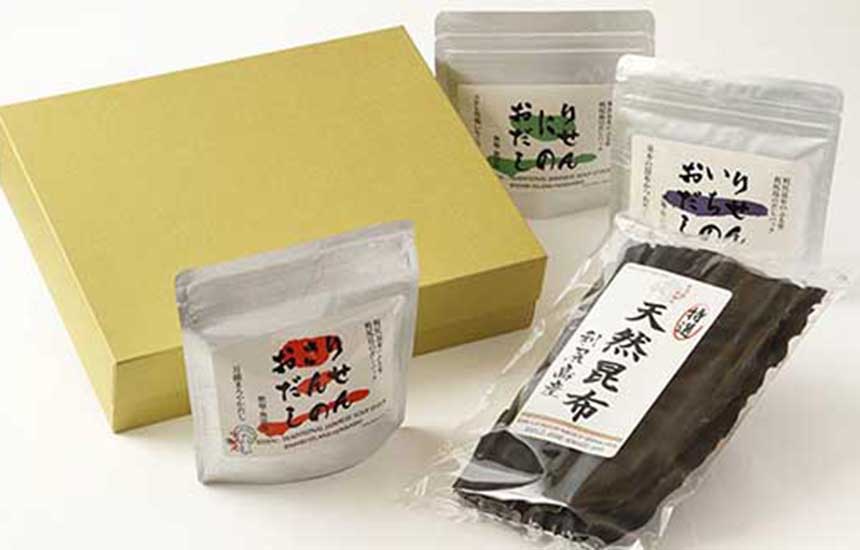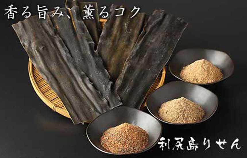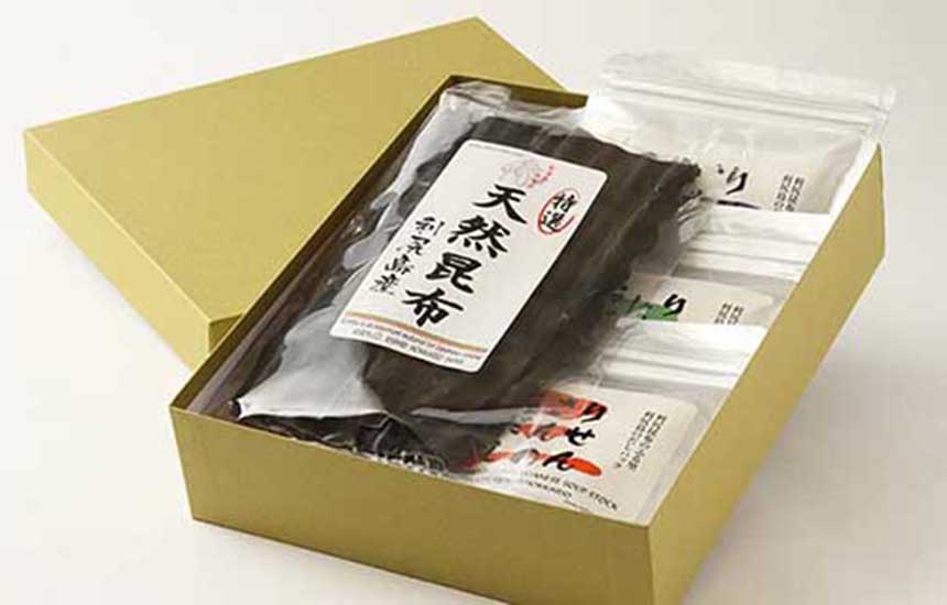 「国産の厳選素材を使用、塩分や保存料など一切使用していない完全無添加、袋を破っても使用可能」 のりせんのおだしに、利尻島でとれた貴重な天然昆布をセットにしました。